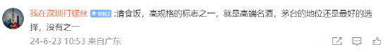 有网友评论说,“请食饭,高规格的标志之一,就是高端名酒,茅台的地位还是最好的选择,没有之一”。