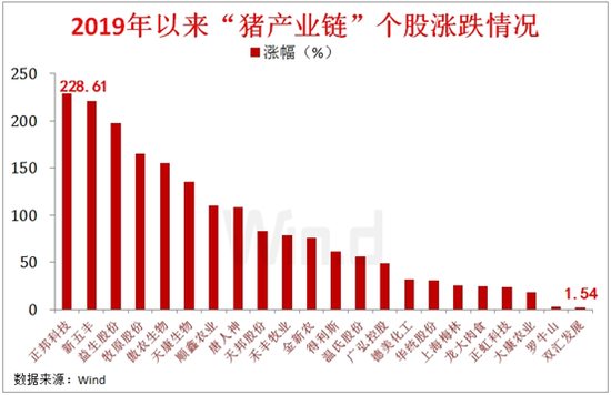 Wind统计显示,纳入猪产业概念指数的22只A股,今年以来均录得正增长,有8只个股的涨幅超过100%。其中,正邦科技、新五丰、益生股份涨幅分别达228.61%、221.01%、197.15%。