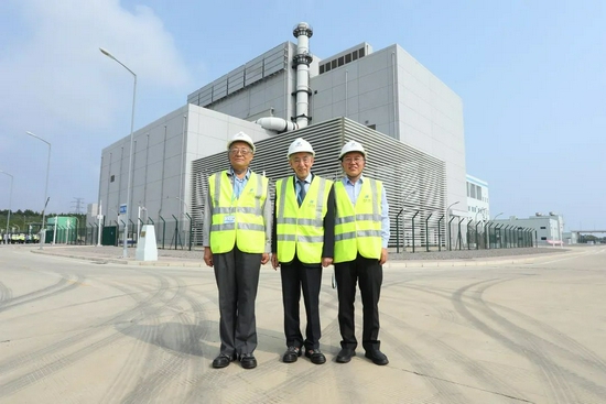 2021年9月12日,王大中(中)、吴宗鑫(左)、张作义(右)在山东石岛湾高温气冷堆示范工程现场