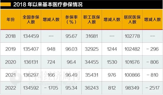 根据国家医保局发布的《全国医疗保障事业发展统计公报》显示,2022年全国基本医疗保险参保人数为13.46亿人,相比上一年少了1705万人,其中职工医保增长812万人,而居民医保则少了2517万人。