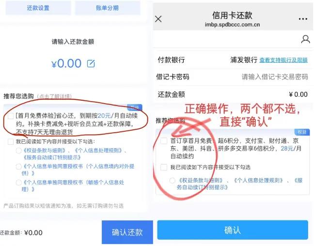 为何又不知不觉订阅增值服务了?吴燕查询后发现,原来是浦发信用卡把“增值服务”和“我已阅读并接受条款”的选项进行并列,她全部勾选后点击确认还款就完成订阅了。