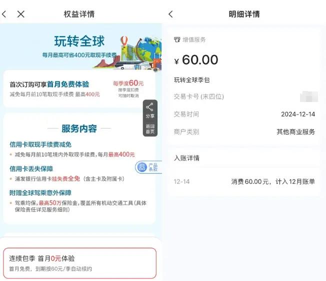 2024年11月,为办理购车贷款,吴燕向浦发银行申办了信用卡。收到卡片后,她在当月14日激活。一个多月后,因为一次退款吴燕去查账,却意外发现浦发信用卡在12月14日给她扣了60元,账单显示是玩转全球的季度扣费。