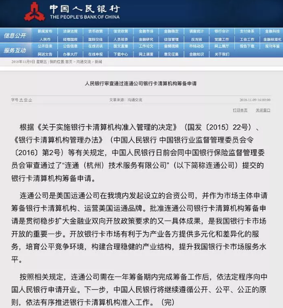 2016年12月,央行等十四部门发布《关于促进银行卡清算市场健康发展的意见》,要求从市场准入、价格形成、消费者权益保护、市场规范等方面健全银行卡清算服务的市场化机制,稳妥有序开放银行卡清算市场。