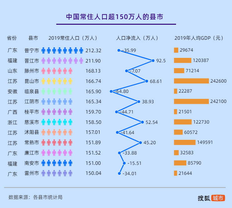 若从常住人口的维度来看,能超过150万人的县市要少很多。据搜狐城市不完全统计,截至2019年常住人口超过150万人的县市共有13个,除了户籍人口本就极高的普宁、滕州、临泉、桂平、沐阳、廉江、南安和雷州之外,还有福建晋江市,江苏昆山市、江阴市、常熟市,以及浙江慈溪市,都是人口净流入大县。