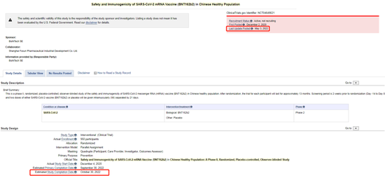 健识局在全球权威的临床试验登记网站ClinicalTrials.gov看到:5月3日时,“复必泰”中国Ⅱ期临床试验的预计完成日期已修改为今年10月30日。