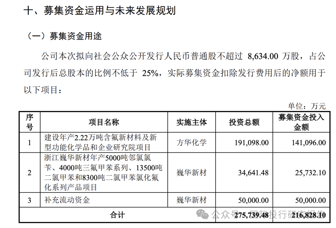 5 、目前巍华新材踢掉了 5 亿补流,融资变成16.68 亿。募资项目包括建设年产2.22万吨含氟新材料及新型功能化学品和企业研究院项目和年产5000吨邻氯氯苄、4000吨三氟甲苯系列、13500 吨二氯甲苯和8300吨二氯甲苯氯化 氟化系列产品项目。看了一下,目前巍华新材的全部生产设备价值只有 1.4 亿。而募资中 14.1 亿用在第一个项目中,其中大部分又是建设厂房等。去年一年,看了很多募资的上市公司,唯一的感觉就是办公楼厂房建好了,这样的募资啊,一言难尽。