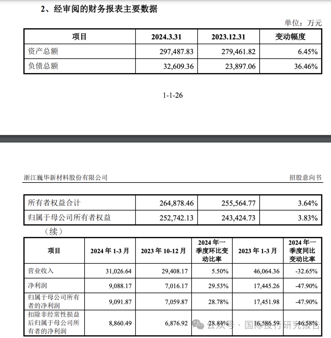 3 、根据巍华新材IPO意向书,预计2024年上半年营业收入6.30亿元至7.10亿元,同比下降28.07%至18.94%;归属于母公司所有者的净利润1.83亿元至2.16亿元,同比下降44.43%至34.40%;扣除非经常性损益后归属于母公司所有者的净利润1.79亿元至2.09亿元,同比下滑44.72%至35.44%。