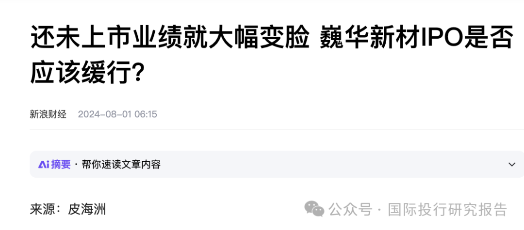 巍华新材发布了在主板 IPO 的招股意向书,预计8 越 5 日申购,但看了一下意向书,有一种上海 40 度的高温下突然感受到大冬天的味道,因为公司未上市,业绩已经变脸了,以至于资本市场的老兵皮海洲老师发表了一篇文章“还未上市业绩就大幅变脸 巍华新材IPO是否应该缓行?”