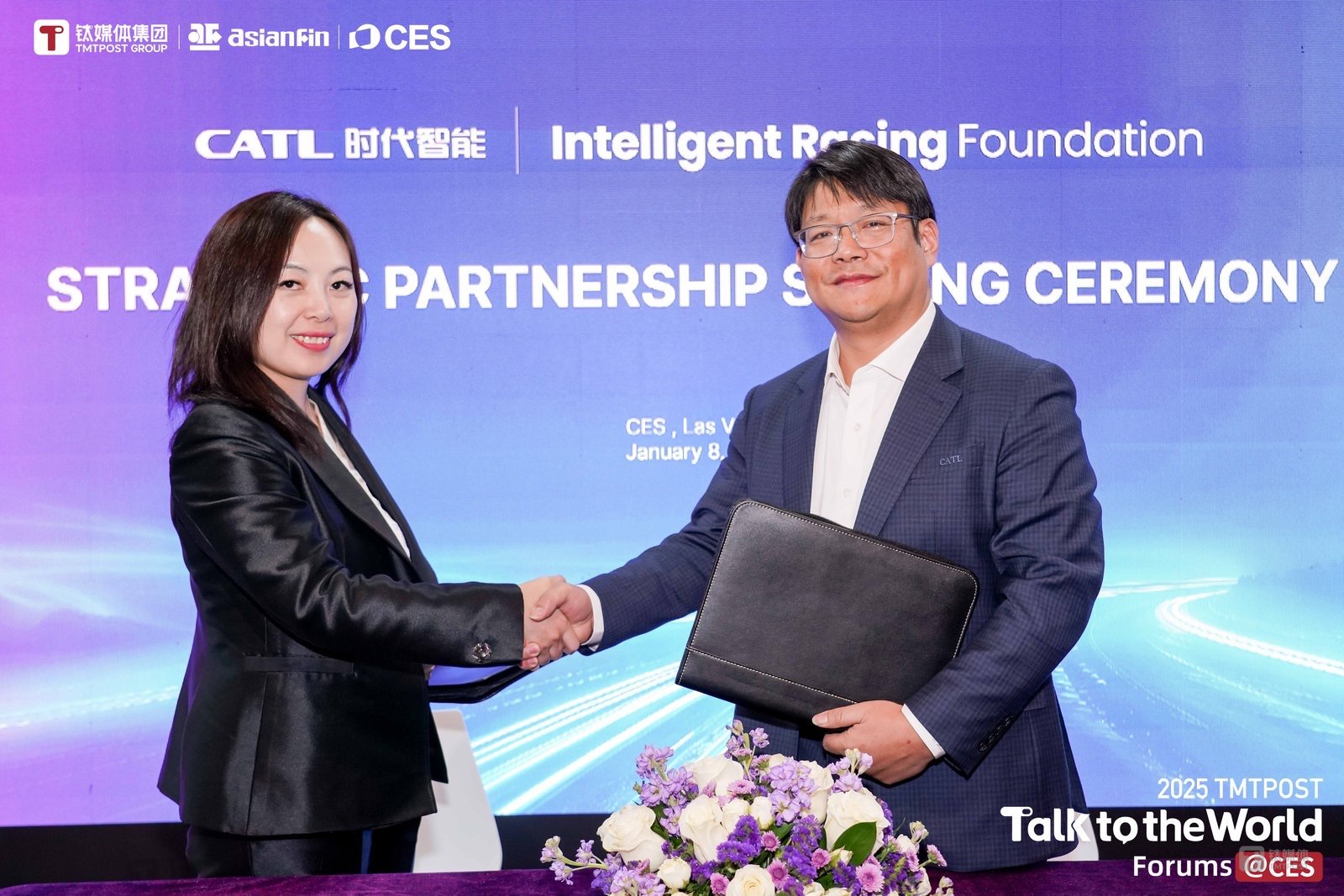 2025年1月8日,在2025年全球消费者电子展(CES)钛媒体“对话世界”论坛上,智脑竞速基金会(Intelligent Racing Foundation)与宁德时代智能科技全球首发战略合作。