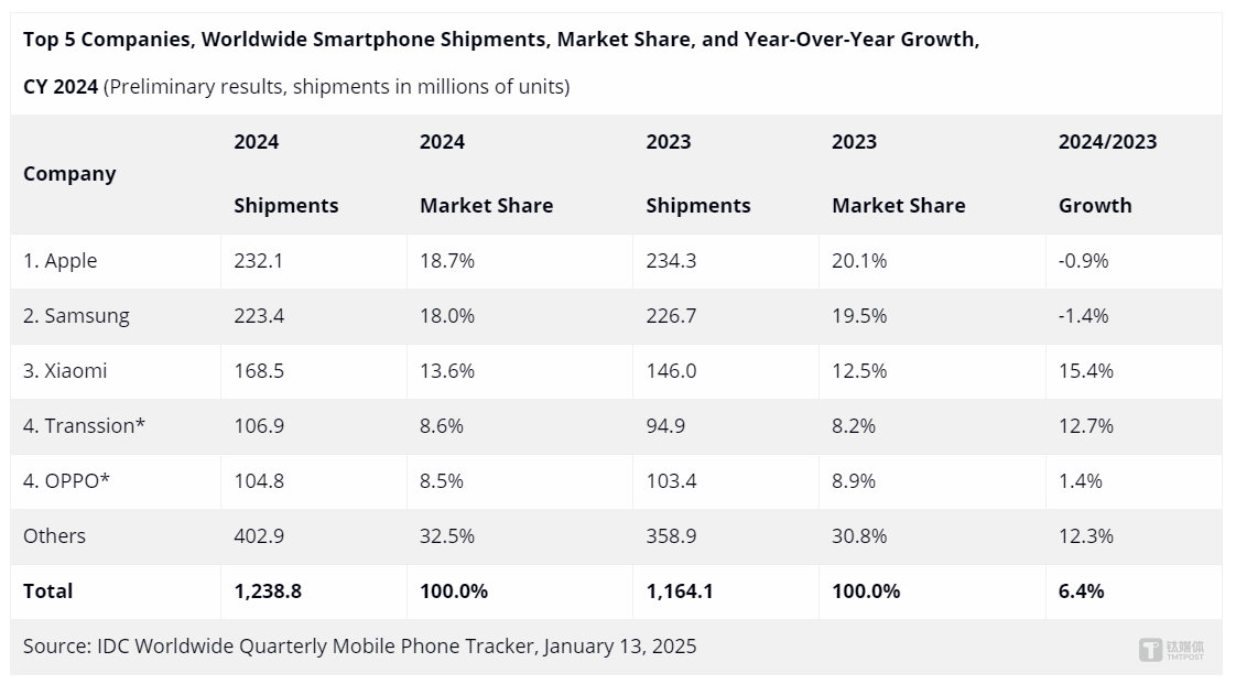 日前,伴随着2024年第四季度报告的出炉,智能手机市场终于是交出了答卷。单从数据的变化来看,这次的期末考试表现实属不错,逆转了前两年的负增长,没有辜负年初的期待。根据IDC发布的数据显示,2024年全年全球智能手机同比增长6.4%,出货量达到12.4亿部。