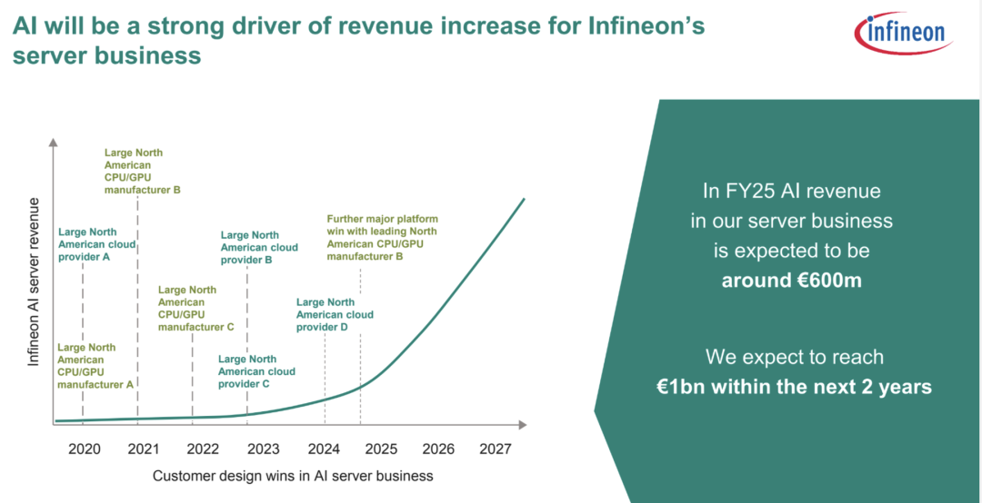 预计2025财年,英飞凌的AI服务器电源业务收入将达到6亿欧元,并有望在未来两年内突破10亿欧元。