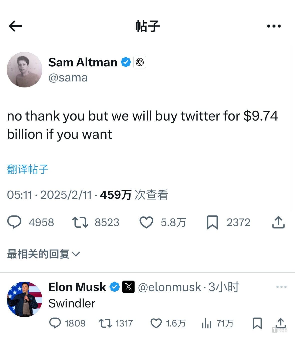 对此,奥尔特曼在社交平台上隔空“阴阳”回应:“谢谢,不。但如果你愿意的话,我们愿意以97.4亿美元的价格收购推特(特意称X为推特)。”