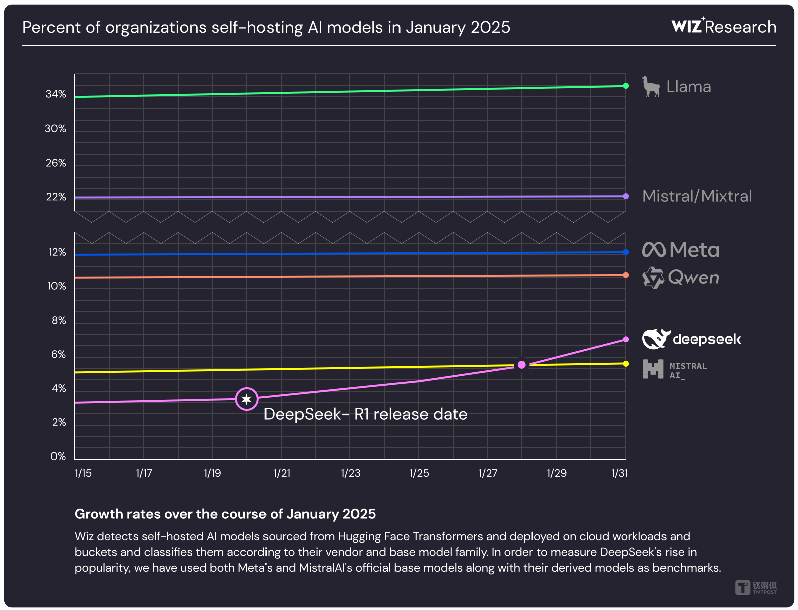 报告同时分析了中国大模型产品DeepSeek自发布以来带来的AI市场增量。得益于DeepSeek-R1的发布,仅在今年1月,基于自托管AI模型进行开发的企业或组织就增加了一倍多,达到7%。