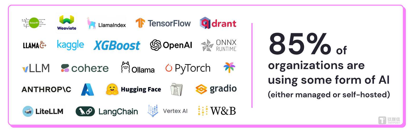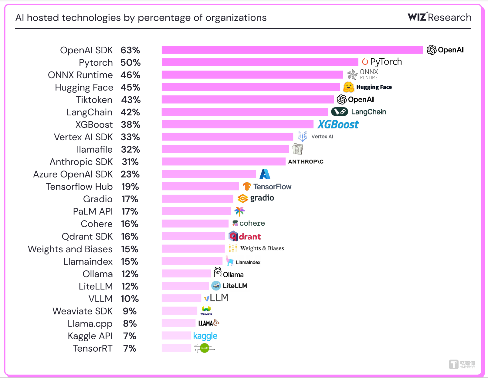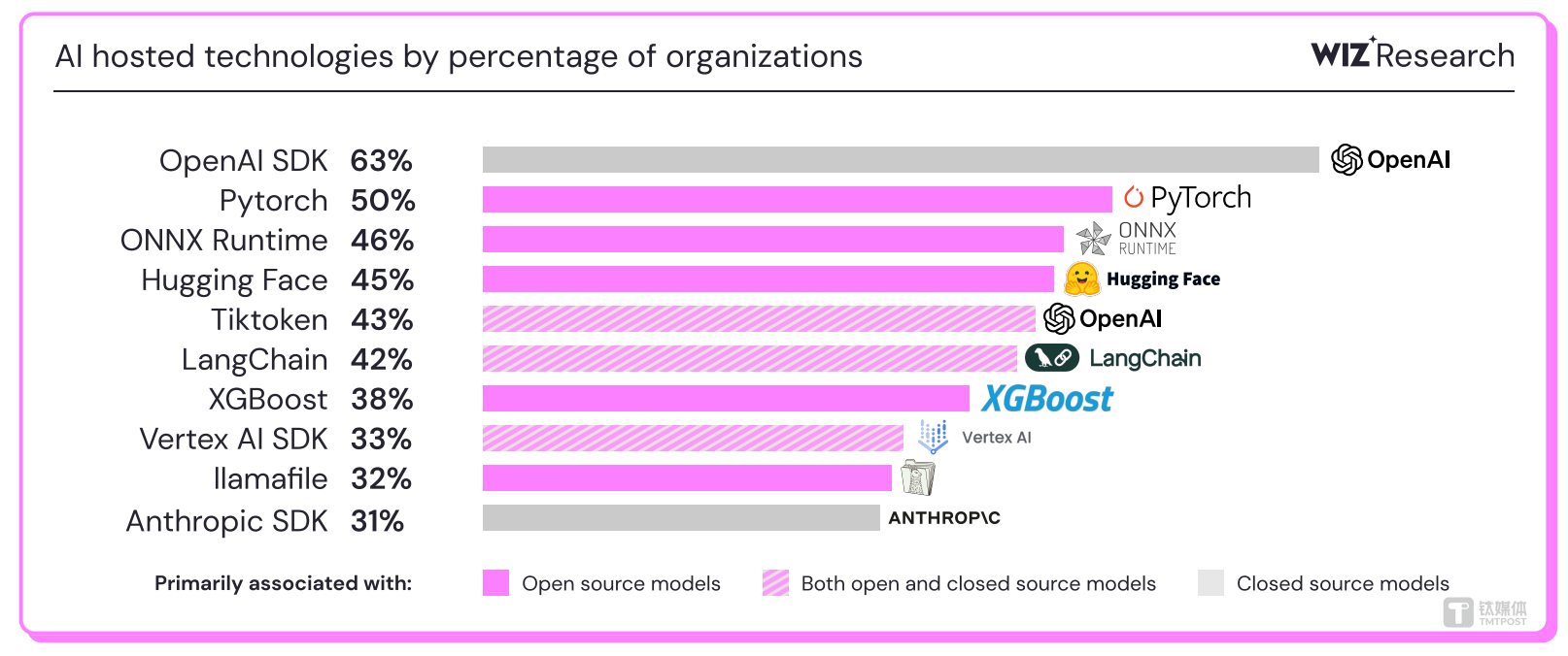 此外,67%基于云环境调用的是OpenAI或Azure OpenAI接口,高于去年的53%。排名前五的还有Pytorch(50%)、ONNX Runtime(46%)、Hugging Face Transformers(45%)和Tiktoken(43%)。