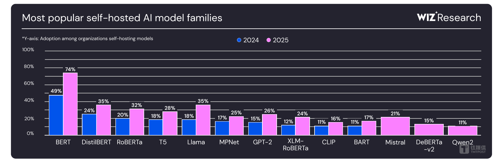 与去年相比,自托管的AI模型采用率有所提高。在选择这一方式的企业组织中,最受欢迎的则是BERT。BERT于2018年由谷歌提出,奠定了NLP领域预训练大模型的基调。直到目前,在最流行的模型排行中,BERT仍在稳固其主导地位,从49%增长到74%,值得关注的是,Mistral AI的Le Chat,阿里Qwen2成为新的竞争者。