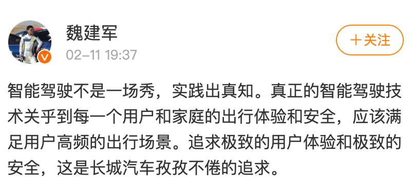 2月11日晚间,近年带领长城在智驾能力上穷追猛赶的魏建军则称:“智能驾驶不是一场秀,实践出真知。真正的智能驾驶技术关乎到每一个用户和家庭的出行体验和安全,应该满足用户高频的出行场景。”