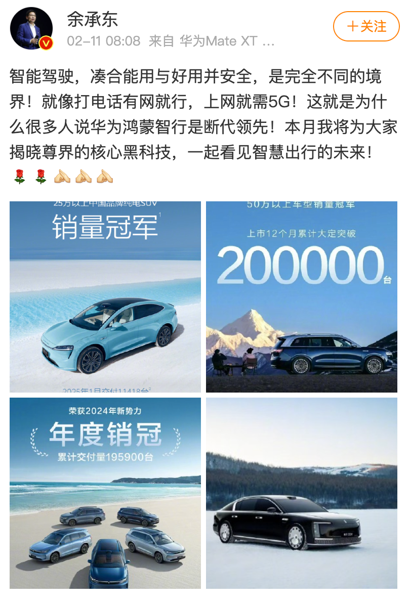 相比之下,余承东的回应显得有些“不淡定”。2月11日早上,他在社交平台强调智驾水平的差异:“智能驾驶,凑合能用与好用并安全,是完全不同的境界!就像打电话有网就行,上网就需5G!”