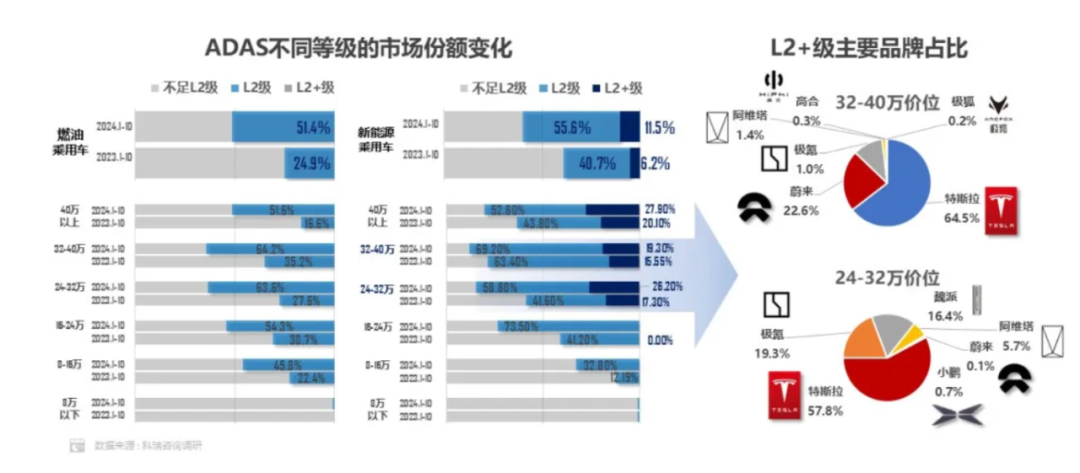 2024年1-10月新能源乘用车L2级及以上的辅助驾驶市场份额,图源中国汽车流通协会微信公众号