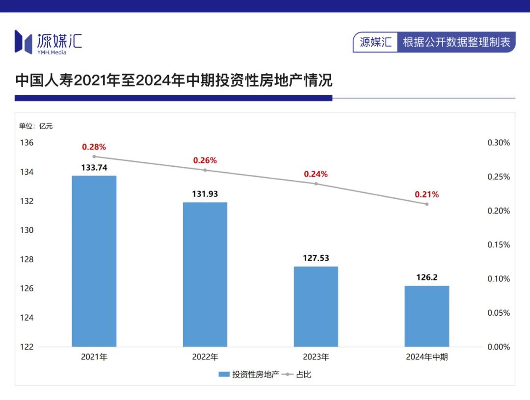 相比2021年,中国人寿目前投资性房地产规模虽然呈向下趋势,但尚未出现大幅度下滑,2024年中期为126.2亿元,占比为0.21%。