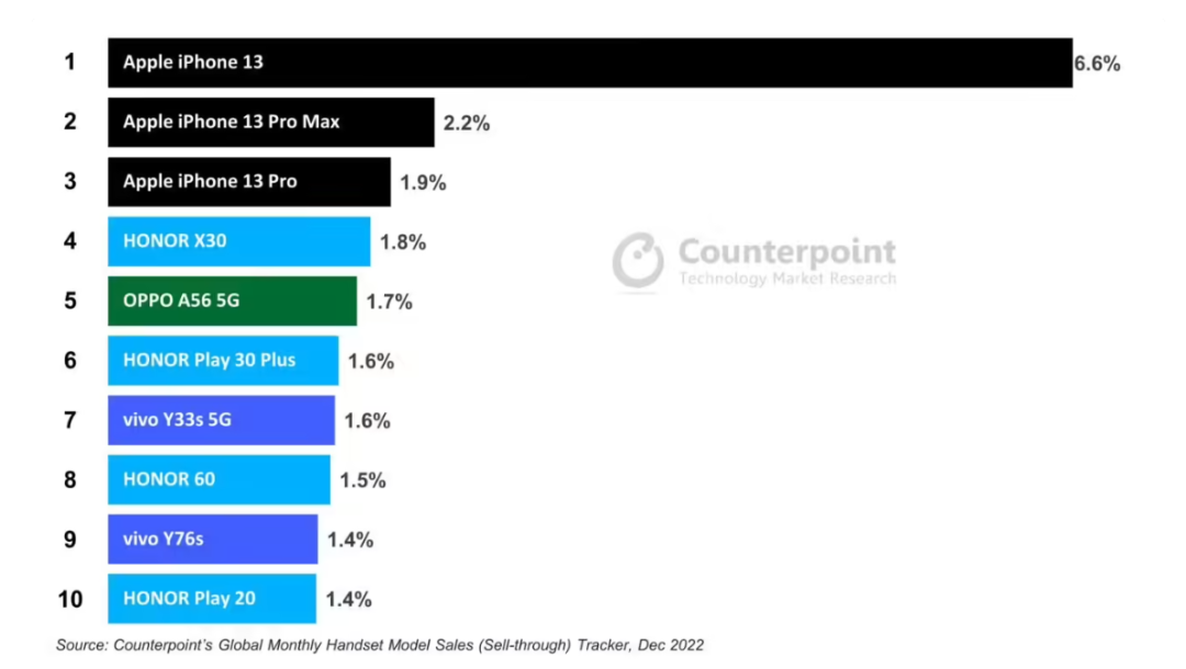 苹果在2022年推出的第三代iPhone SE系列产品也是如此。根据Counterpoint Research发布的数据,就2022 年中国市场销量而言,iPhone 13是最畅销的智能手机机型,贡献了6.6%的市场份额,随后是iPhone13和iPhone Pro Max,第三代iPhone SE系列产品都排不进前十。