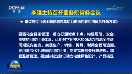 会议指出,当前我国新能源汽车动力电池已进入规模化退役阶段,全面提升动力电池回收利用能力水平尤为重要。要强化全链条管理,着力打通堵点卡点,构建规范、安全、高效的回收利用体系,运用数字化技术加强动力电池全生命周期流向监测,实现生产、销售、拆解、利用全程可追溯。要用法治化手段规范回收利用,制定完善相关行政法规,加强监督管理。要加快制定修订动力电池绿色设计、产品碳足迹核算等相关标准,以标准引领带动回收利用。