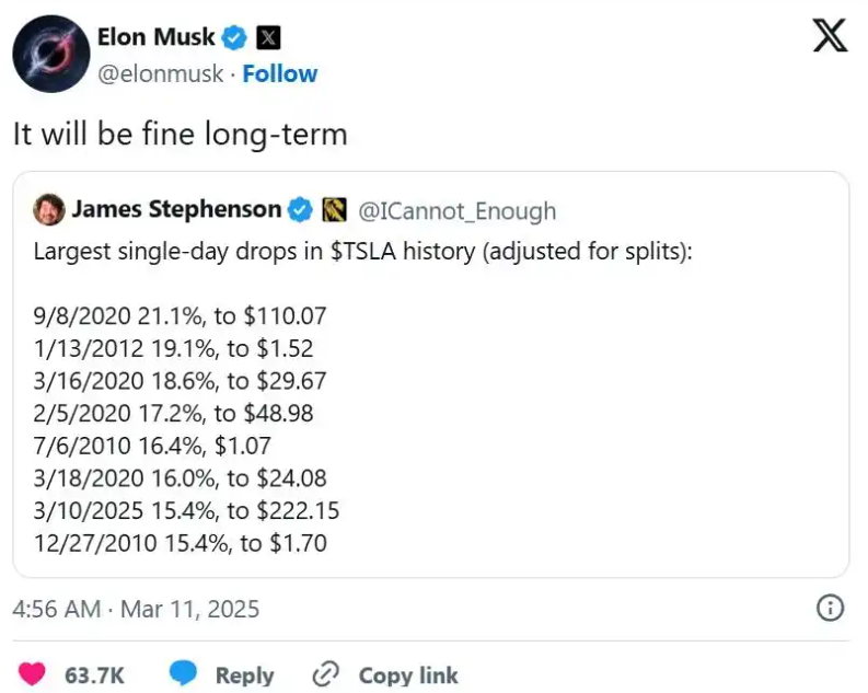 本周一,马斯克在推特上回复了一篇关于特斯拉创下历史上最大单日跌幅的帖子称:“从长期来看,一切都会好的。”