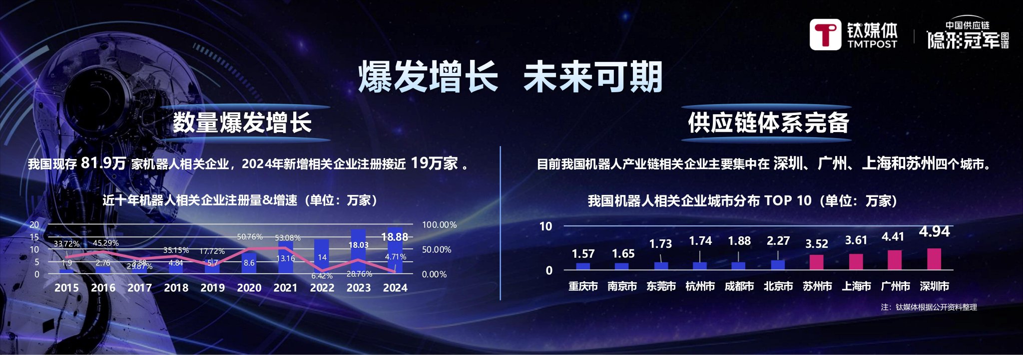 我们做了一些数据梳理:人形机器人产业正在爆发式增长,目前有二十多万家相关企业,2024年就注册了19万家。这个产业主要集中在深圳、广州、上海、苏州这些制造业发达地区。注册资本200万以上的企业超过五成,专利数量年增长率达到200%以上。