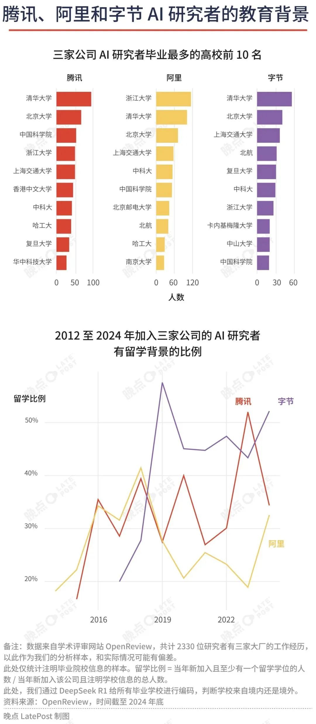 三家大厂研究人员的学历也更漂亮。在腾讯,香港中文大学进入前六;字节的研究者中,卡内基梅隆大学毕业生数量能排第八,有留学经历的研究者占比超四成。