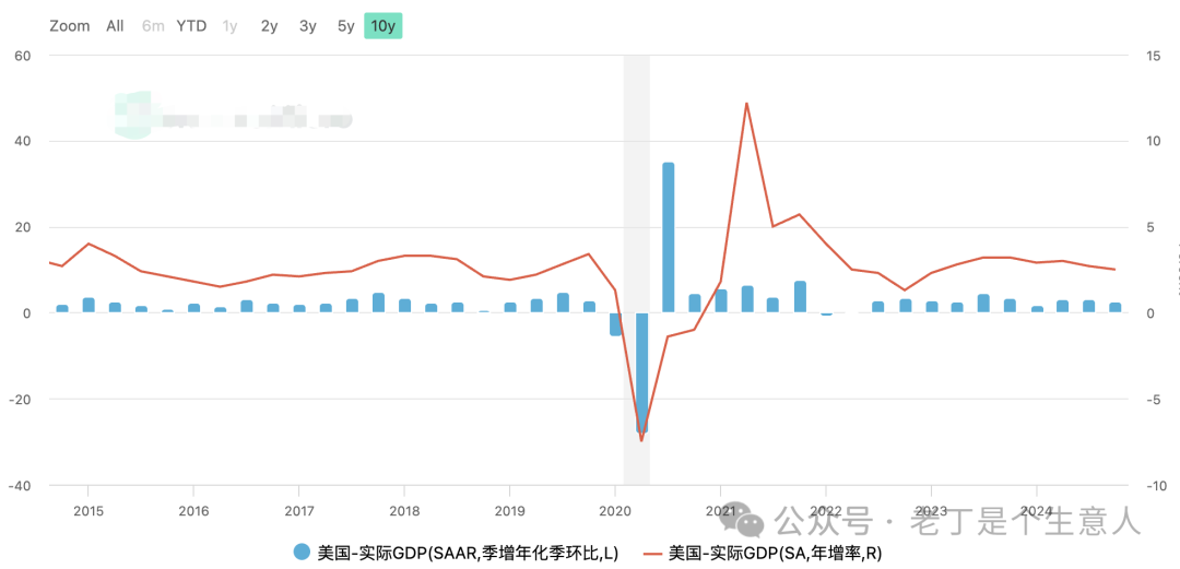 如果我们再看一眼现在的美国GDP数据,季环比还在2.4%,年增率还在2.5%(如图)。然后对比刚刚高盛给出的经济数据预测,我们大概就知道现在市场对于今后美国的衰退程度有多大了,年增速几乎减半。