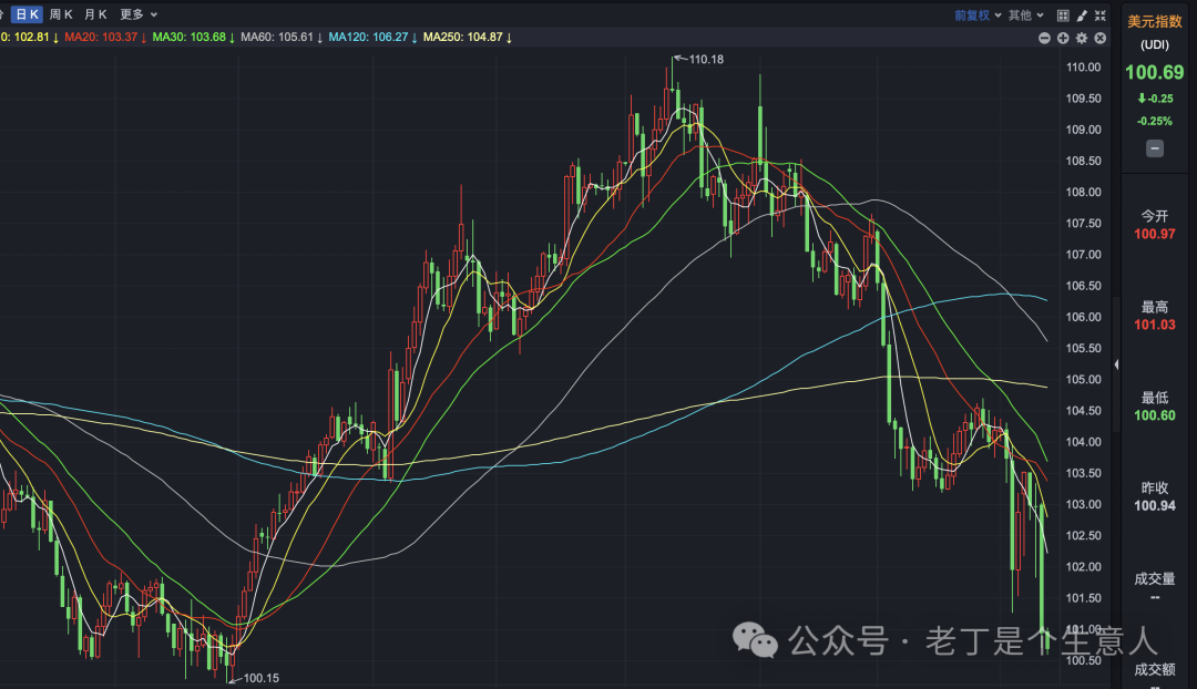 还有美元,原本强势的美元,在关税持续发酵的近一个月,也是迅速贬值(如图)。