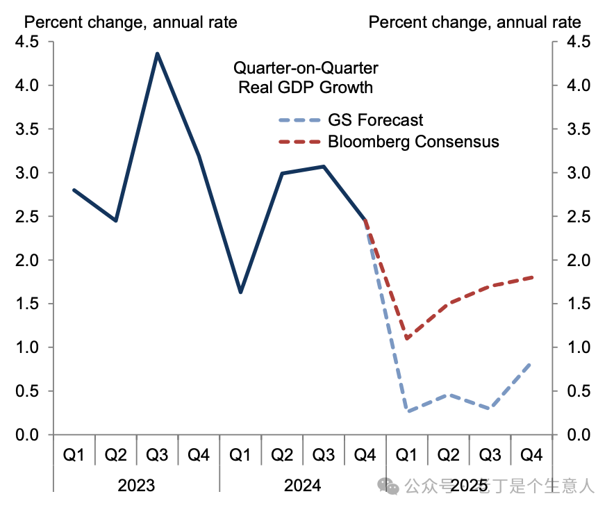 根据高盛最新的一份报告显示,在特朗普关税政策出现之后,高盛将美国的四季度GDP增速预测从此前的1%下调到了0.5%,并将年均GDP的增速预测从1.5%下调至1.3%(如图)。经济衰退概率也从此前的35%提高到了45%。