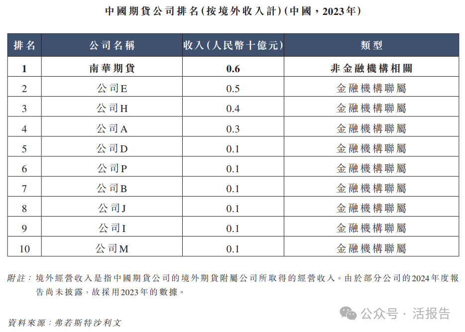 2023年,就中国期货公司的境外收入而言,南华期货在所有期货公司中排名第一,总收入为人民币5.7亿元。