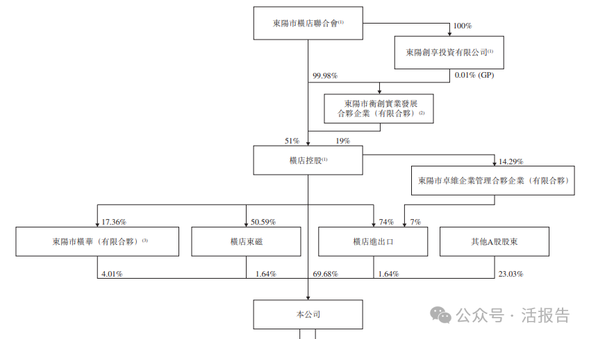 IPO前,东阳市横店联合会控制的横店控股直接及通过横店东磁(002056.SZ)等间接持有约76.97%权益,其他A股股东持股约23.03%。