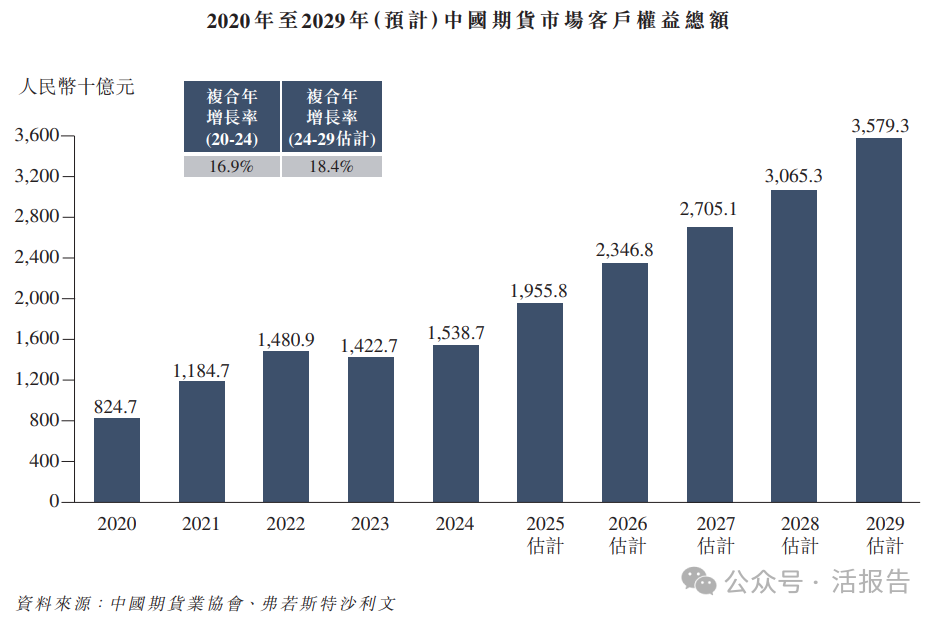 据中国期货协会及弗若斯特沙利文的数据,2020年至2024年,中国期货市场的客户权益总额从人民币8,247亿元大幅增长至人民币15,387亿元,CAGR为16.9%。2024年至2029年,客户权益总额预计将增至人民币35,793亿元,预计CAGR为18.4%。