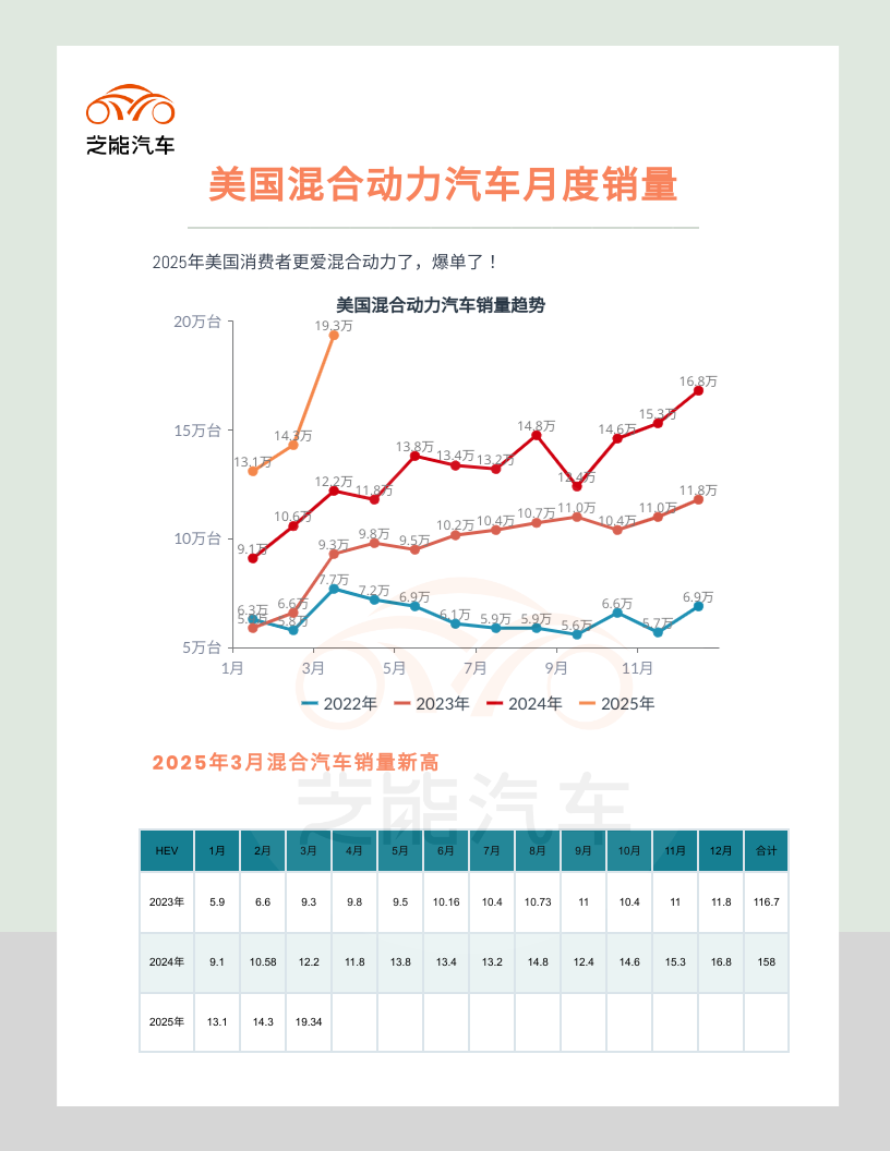 ◎ 混合动力汽车(HEV)销量达到193,419辆,同比增长56.1%,其中轿车62,939辆,长续航型汽车(主要为SUV和卡车)130,480辆。