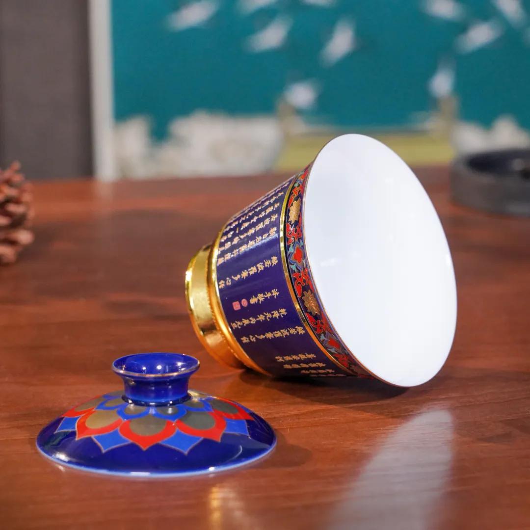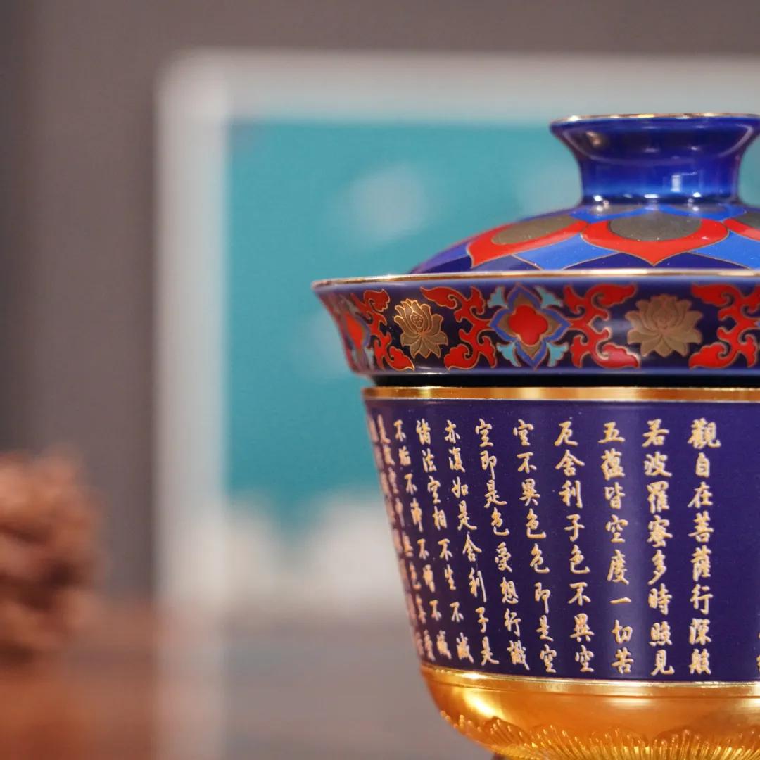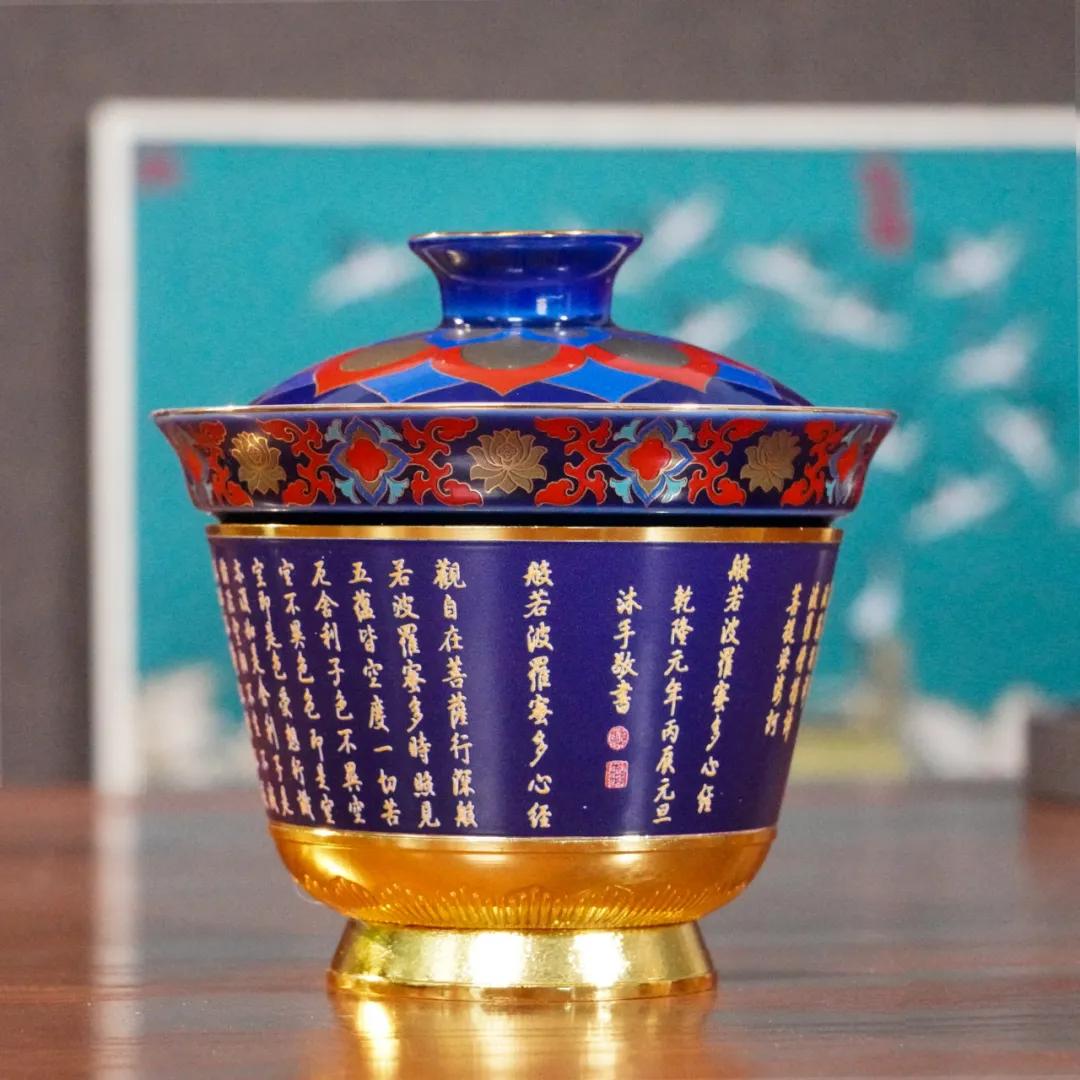 乾隆御笔心经转心杯,以中国经典三色之一——蓝色为主色调,盏身线条圆润,开口宽敞,华贵高雅。