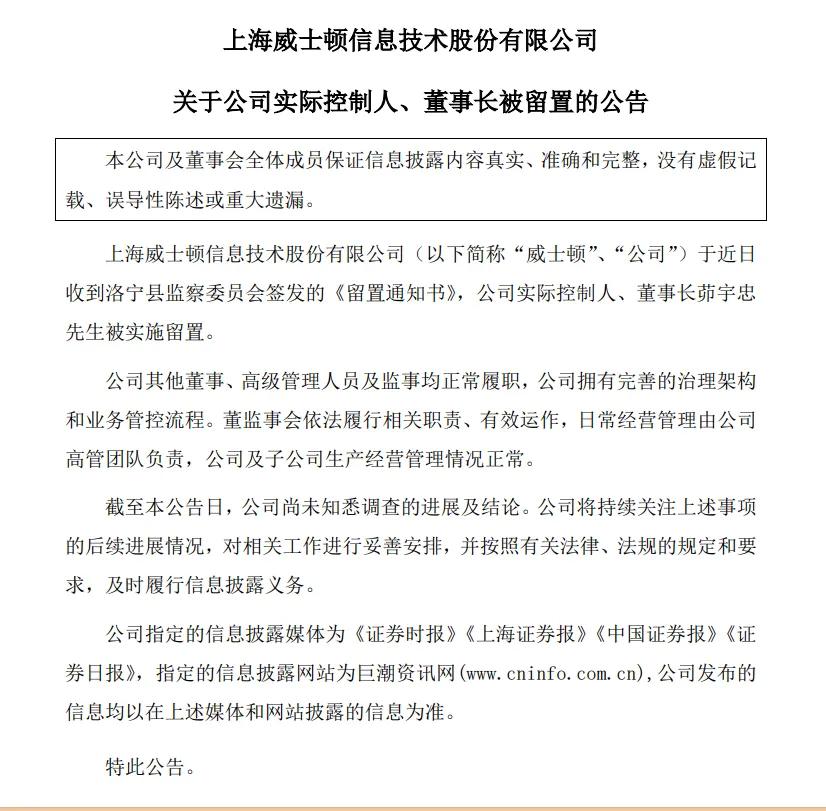5 、威士顿2024年6月24日曾公告,公司收到洛宁县监察委员会签发的《留置通知书》,公司实际控制人、董事长茆宇忠先生被实施留置。10月24日,公司公告称,公司收到相关部门于2024年10月23日签发的《解除留置通知书》,已解除对茆宇忠先生的留置措施。