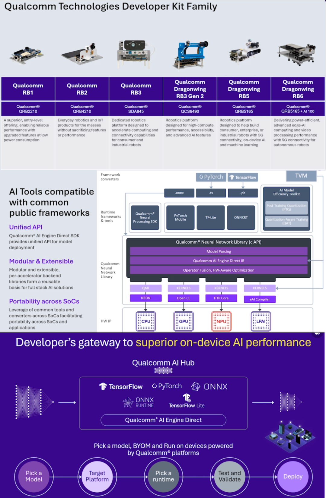◎开发便捷性:高通提供机器人SDK与ROS2支持,兼容Linux、Ubuntu等系统,集成vSLAM、路径规划及自主导航功能。开发套件(如RB5、RB6)具备5G连接与边缘AI能力,简化从原型到量产的流程。