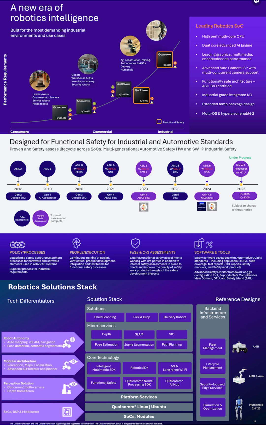 其机器人SoC产品线覆盖多场景需求:QCS5430适用于消费级割草机器人,QCS8490/8550面向仓储AMR,IQ-8300/9075支持农业与工业场景。