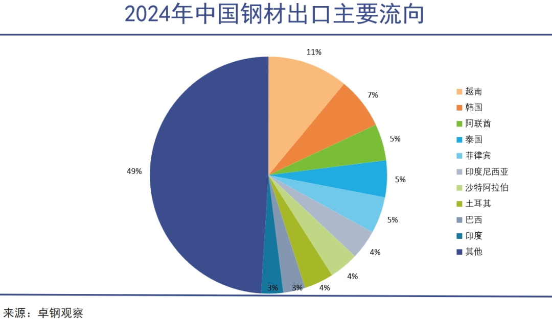 对中国钢铁竖起壁垒的国家中,不少都高度依赖中国钢铁进口。如2024年我国出口到越南和韩国的钢材量分别为1274万吨和819万吨,分别占我国钢材出口总量的11.5%和7.4%,是中国钢铁出口的前两大市场。反倾销措施实施后,中国钢铁价格在这些市场可能失去优势,短期必然会对中国钢铁行业的出口产生冲击。