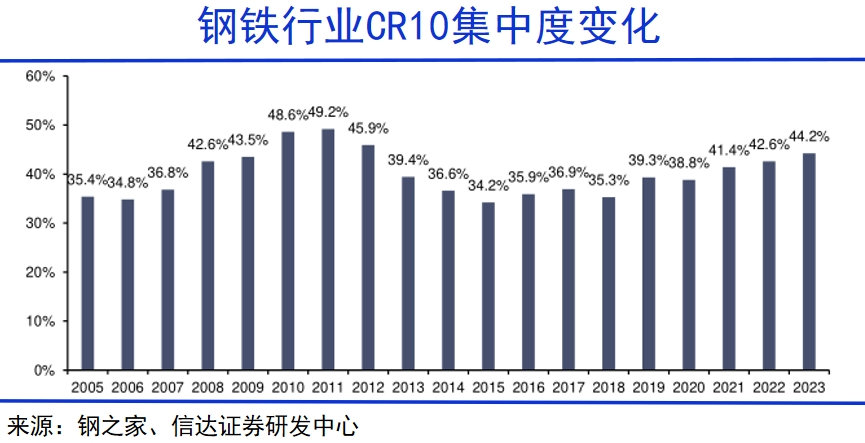 在供给侧改革等一系列政策的推动下,近10年我国钢铁行业集中度已有了一定程度的提升,2015年前十大钢铁企业的市场集中度不到35%,到2023年,这一数字已经上升至44%。企业的兼并重组成了行业整合的大趋势,并且未来这种趋势还将持续。