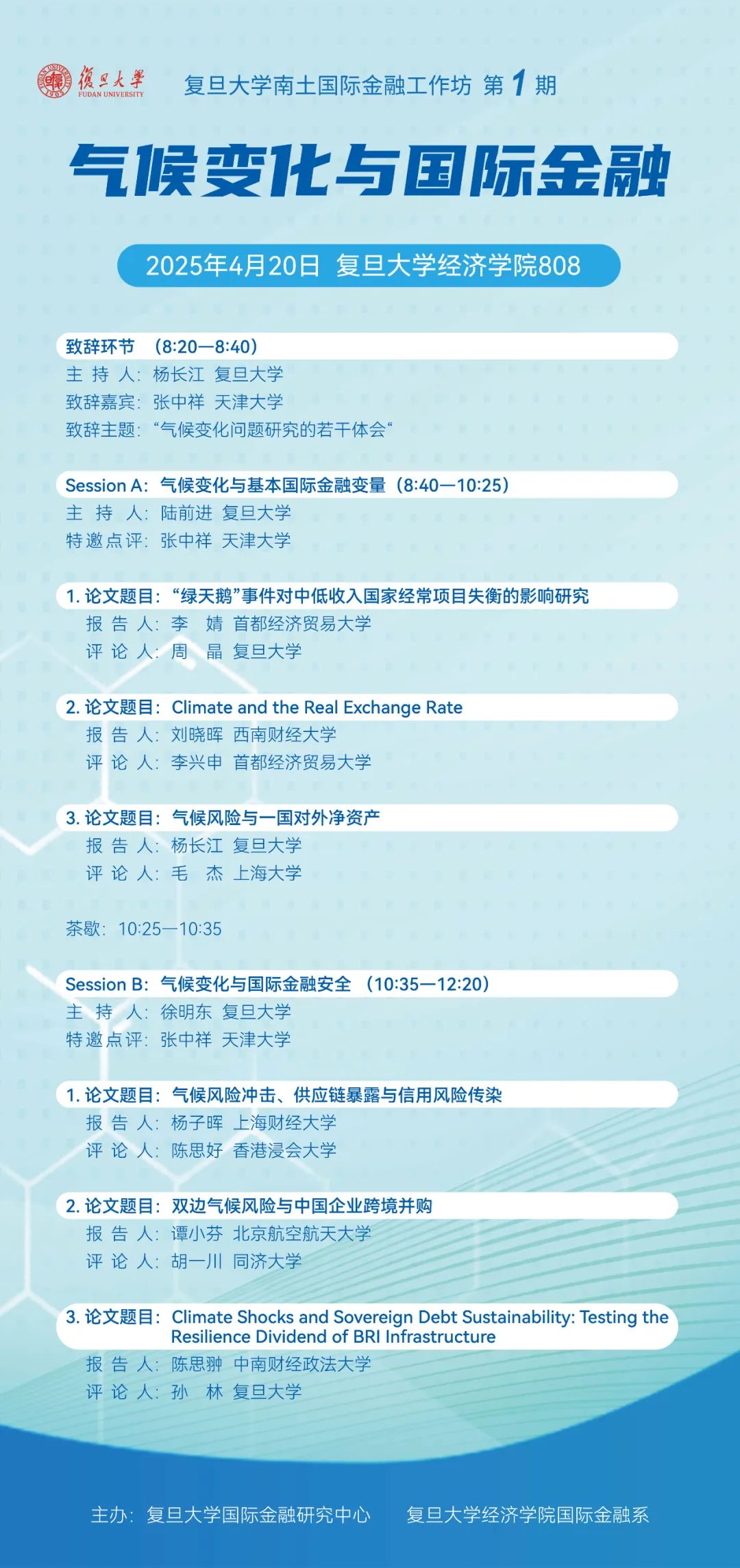 复旦大学经济学院国际金融系主任杨长江教授邀请我在复旦大学南土国际金融工作坊第1期作主旨报告。我告诉他,我是作了不少气候变化与国际贸易的工作,一些还是开创性的,但并没有作与国际金融相关的工作。如果会议主题是气候变化与国际(世界)经济,国际金融是国际经济学科的一个主要方向,或者气候变化与国际贸易,我作主旨报告毫无问题。