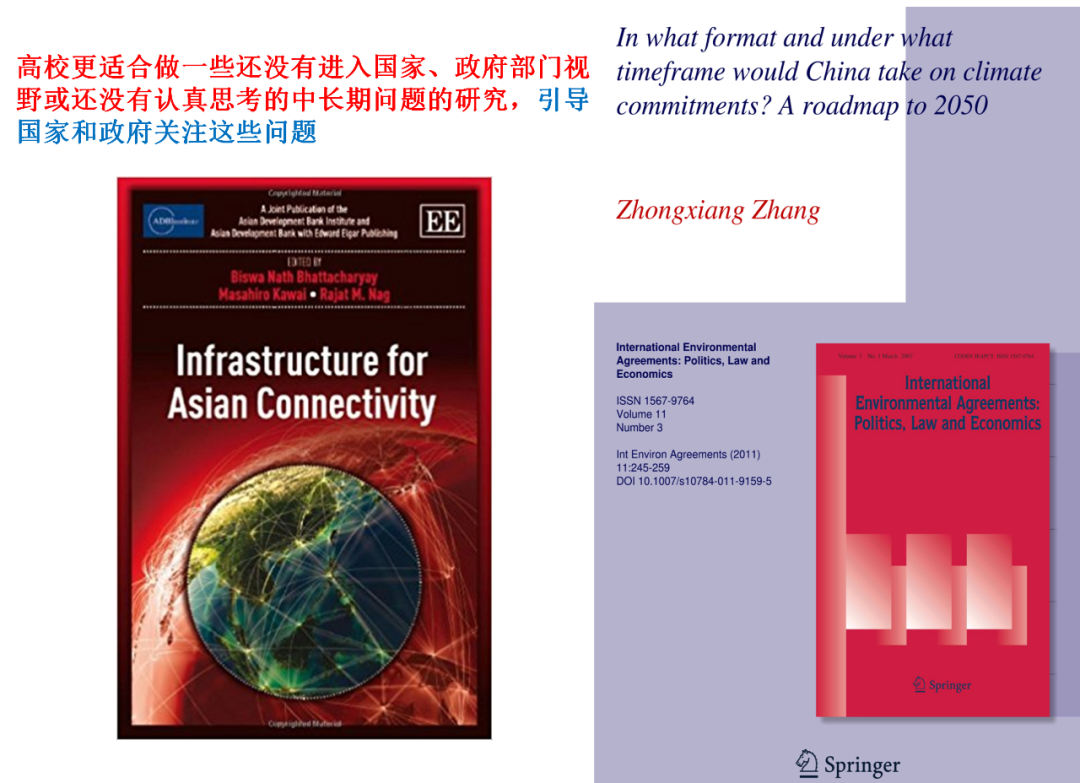 以本人1998年应联合国开发署邀请撰文提出中国应对其2020年单位GDP的碳排放进行控制(1998年在纽约联合国总部和在上述布宜诺斯艾利斯举行的COP4报告过)、2009年应政府间气候变化委员会减缓工作组副主席Carlo Carraro校长之邀撰文提出中国应承诺在2030年左右对温室气体排放总量进行控制、我们2008年完成的亚洲基础设施整合和无缝连接项目成果成为中国政府提出一带一路和亚投行的基础,指出高校更适合做一些还没有进入国家、政府部门视野或还没有认真思考的中长期问题的研究,引导国家和政府关注这些问题。