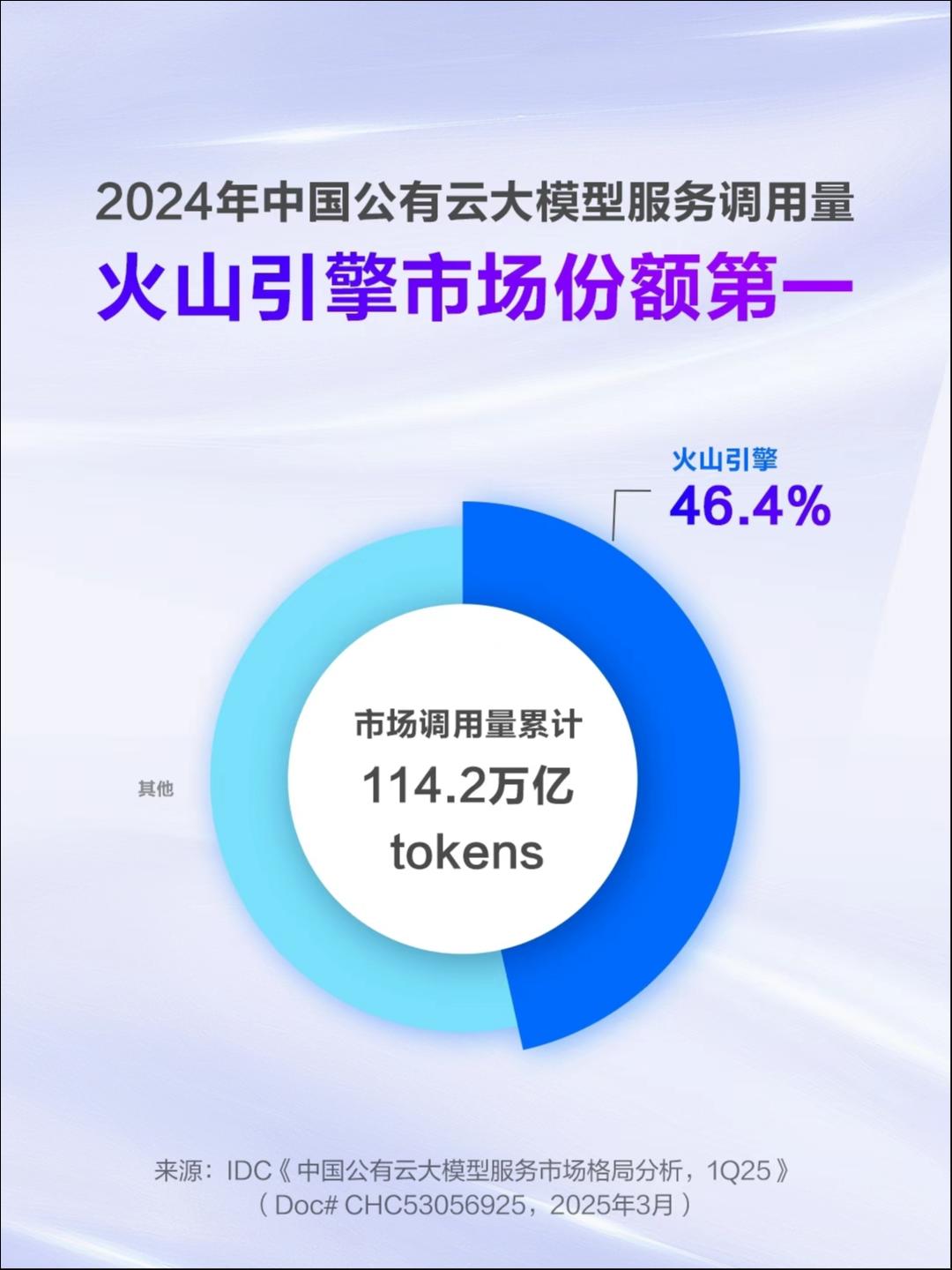 火山引擎是习惯于生长在产业共识之上的,最近IDC发布的《中国公有云大模型服务市场格局分析,1Q25》报告显示,2024年中国公有云大模型调用量,火山引擎以 46.4% 的市场份额位居中国市场第一。