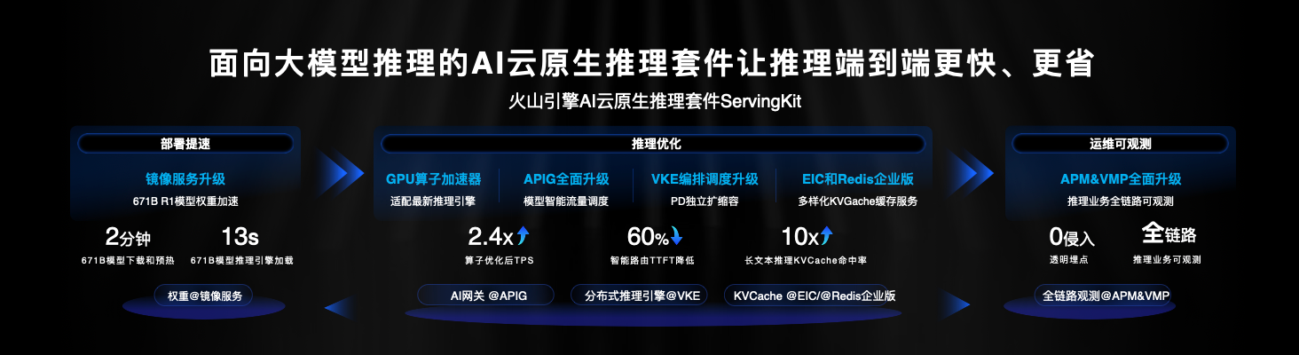 为此,火山引擎一直在以AI云原生为理念推陈出新,譬如本次大会新发布的AI云原生推理套件ServingKit,整合了 AI 容器编排、AI 网关、推理全链路观测和 AI 加速套件的能力,支持在大规模 GPU 集群上运行推理工作负载,表现出更强的推理性能、更优的推理成本、更广泛的生态增强。