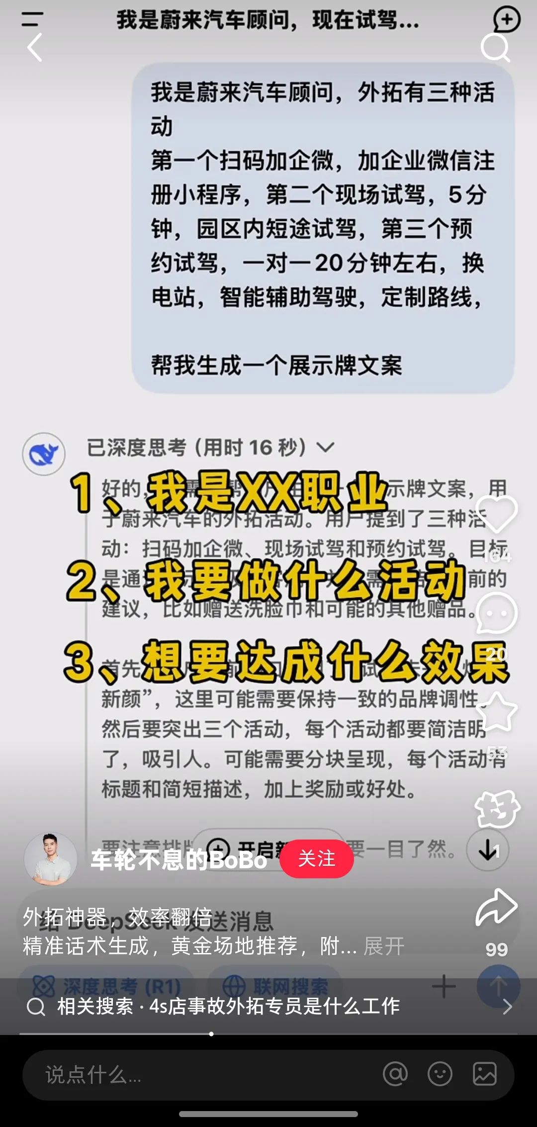 外拓,顾名思义,就是销售走出门店,主动拓客,蔚来的思路是,让一线销售主动触达潜在用户,通过面对面交流,用产品体验和服务打动用户,消解负面舆论的影响。被销售直接种草的一些用户,在后续决策环节会直接搜索具体产品口碑和服务体验相关的内容,这是蔚来的优势领域。