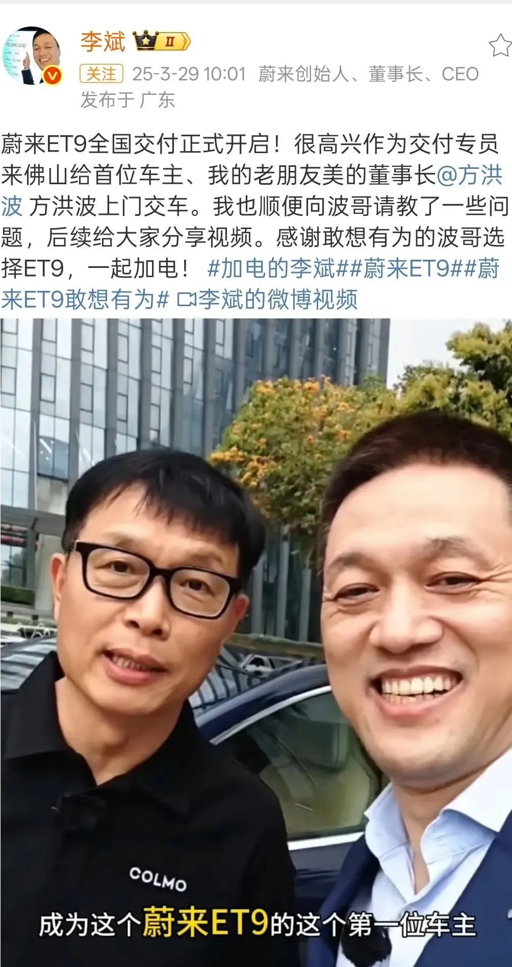 李斌还带头给一线同事做出了示范,目前他已经促成至少三单——美的集团董事长方洪波、分众传媒创始人江南春、京东集团创始人 董事会主席刘强东,先后在李斌拜访公司过程中,下单了蔚来最新的旗舰产品 ET9,3 月 29 日,李斌还客串交付专员,亲自给方洪波交付全国第一辆量产版本 ET9。