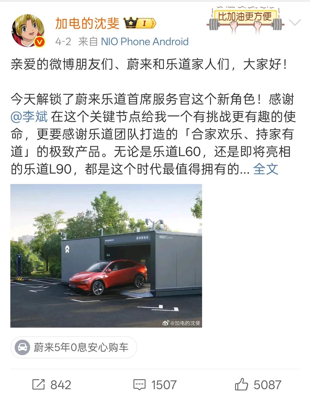 4 月 2 日,蔚来官宣原蔚来能源负责人沈斐接替艾铁成出任乐道总裁,李斌发微博称,沈斐接任后团队的首要任务是“踏踏实实做好销售基本功”。