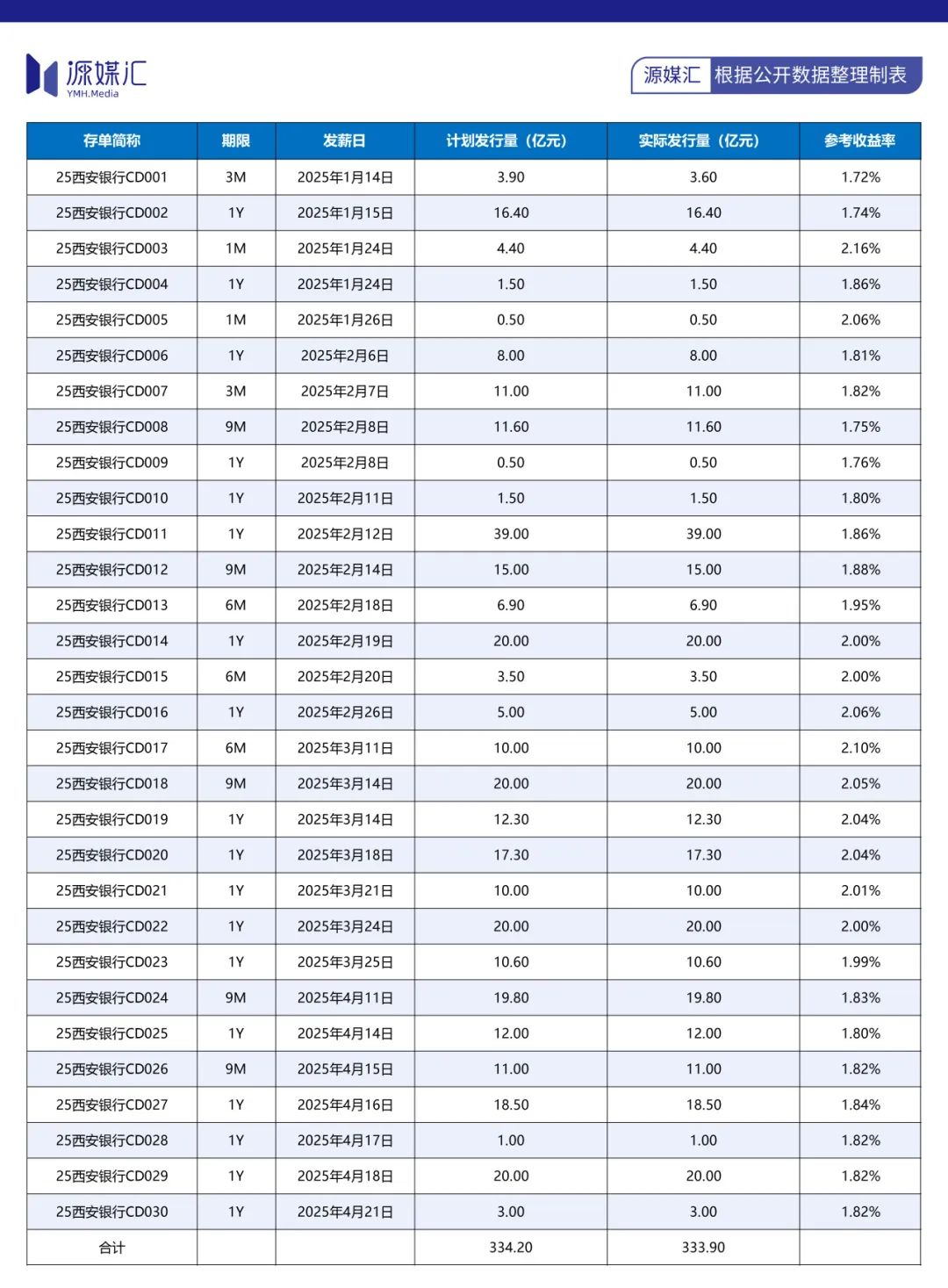 截至4月21日,西安银行2025年以来发行的同业存单金额累计超330亿元。