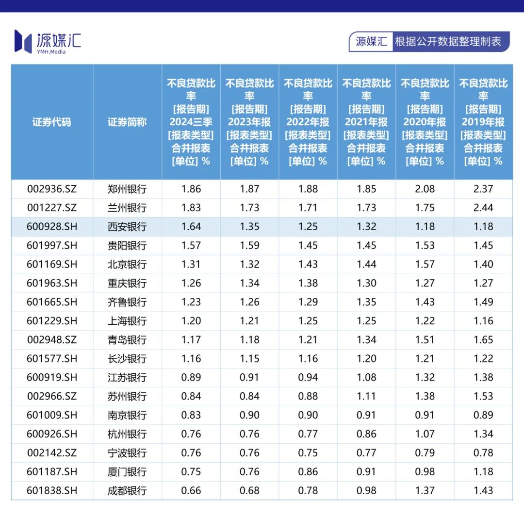 自2019年以来,在A股17家上市城商行中,西安银行的不良贷款率增长迅速,已经从2019年的第13名,上升至2024年第三季度的第3名。